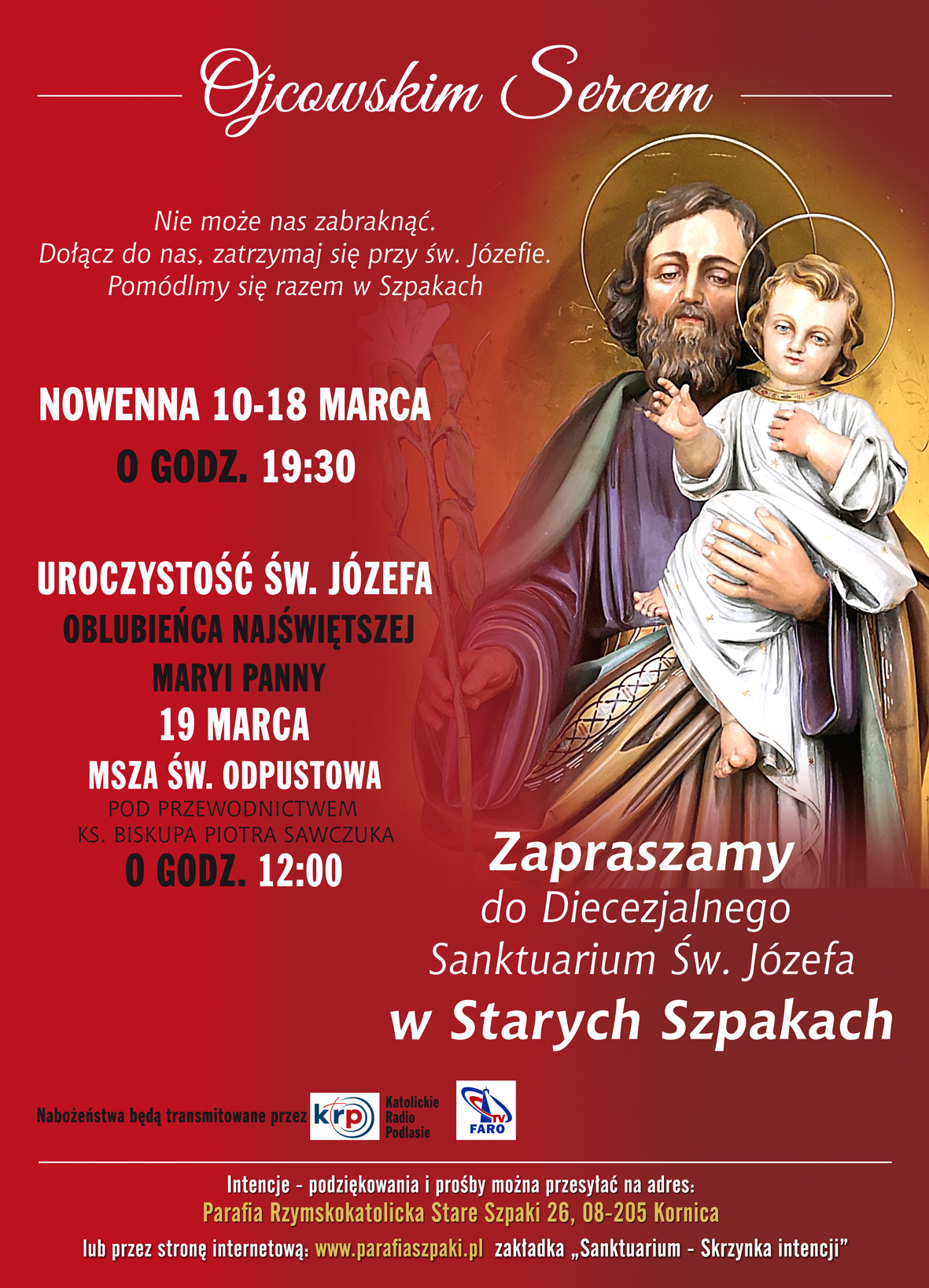 Serdecznie zapraszamy wszystkich wiernych na Uroczystość Św. Józefa do Diecezjalnego Sanktuarium Św. Józefa w Starych Szpakach. Msza Św. odpustowa pod przewodnictwem ks. bp Piotra Sawczuka (Duszpasterza Diecezji Drohiczyńskiej) odbędzie się 19 marca 2022 roku o godz. 12:00.